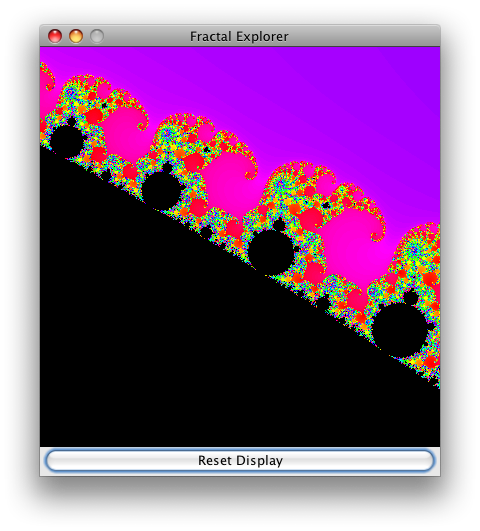 FractalExplorer с размером экрана 800 точек (или сколько желаете, но не слишком большой).createAndShowGUI() этого объекта.drawFractal() этого объекта для того чтобы вычислить и вывести на экран изображение фрактала!Теперь вы можете изучать фрактал Мандельброта, рассматривая его удивительные детали. Если вы сильно увеличите изображение, то столкнетесь с некоторыми интересными проблемами: