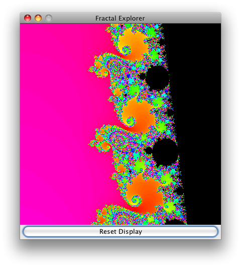 Наконец все готово для того чтобы рисовать фракталы! Теперь надо создать класс FractalExplorer который позволит вам изучить различные фрагменты фрактала, вычисляя их и отображая на экране с помощью графического интерфейса Swing, а также обработать различные сообщения от пользователя.